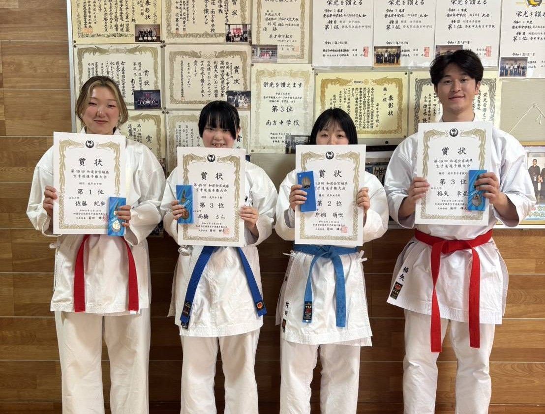 令和8年4月19日(日)宮城県登米市南方武道伝承館で和道会県大会が開催され、本学空手道部から女子3名、男子1名が参加しました。成年女子形の部では佐藤紀歩(現代武道/3年)が第1位、第2位が片桐萌吹(現代武道/4年)、第3位が高橋さら(スポーツ情報マスメディア/2年)でした。また、成年男子形の部では格矢幸星(体育/3年)が第3位となりました。